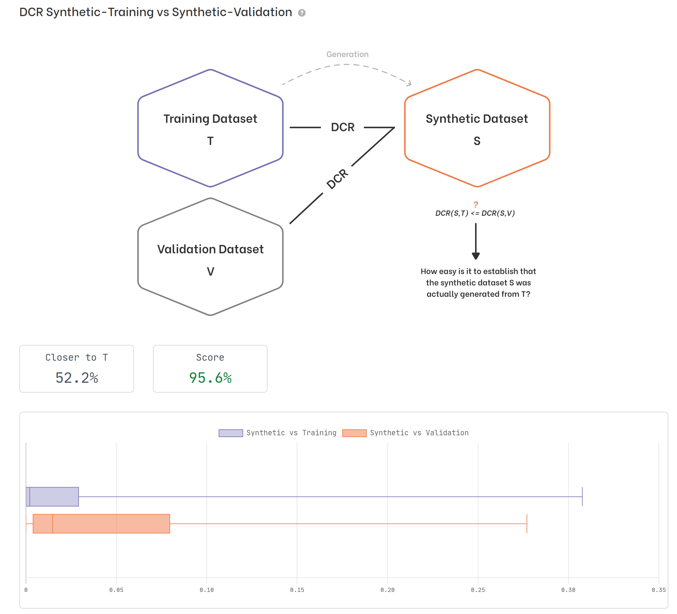 The distribution of distances between synthetic and training instances is very similar (or at least not systematically smaller) than the distribution of distances between synthetic and validation instances. We got a percentage close to 50%: this means that the synthetic dataset does not provide enough information that could lead an attacker to assume whether a certain individual was actually present in the training set.