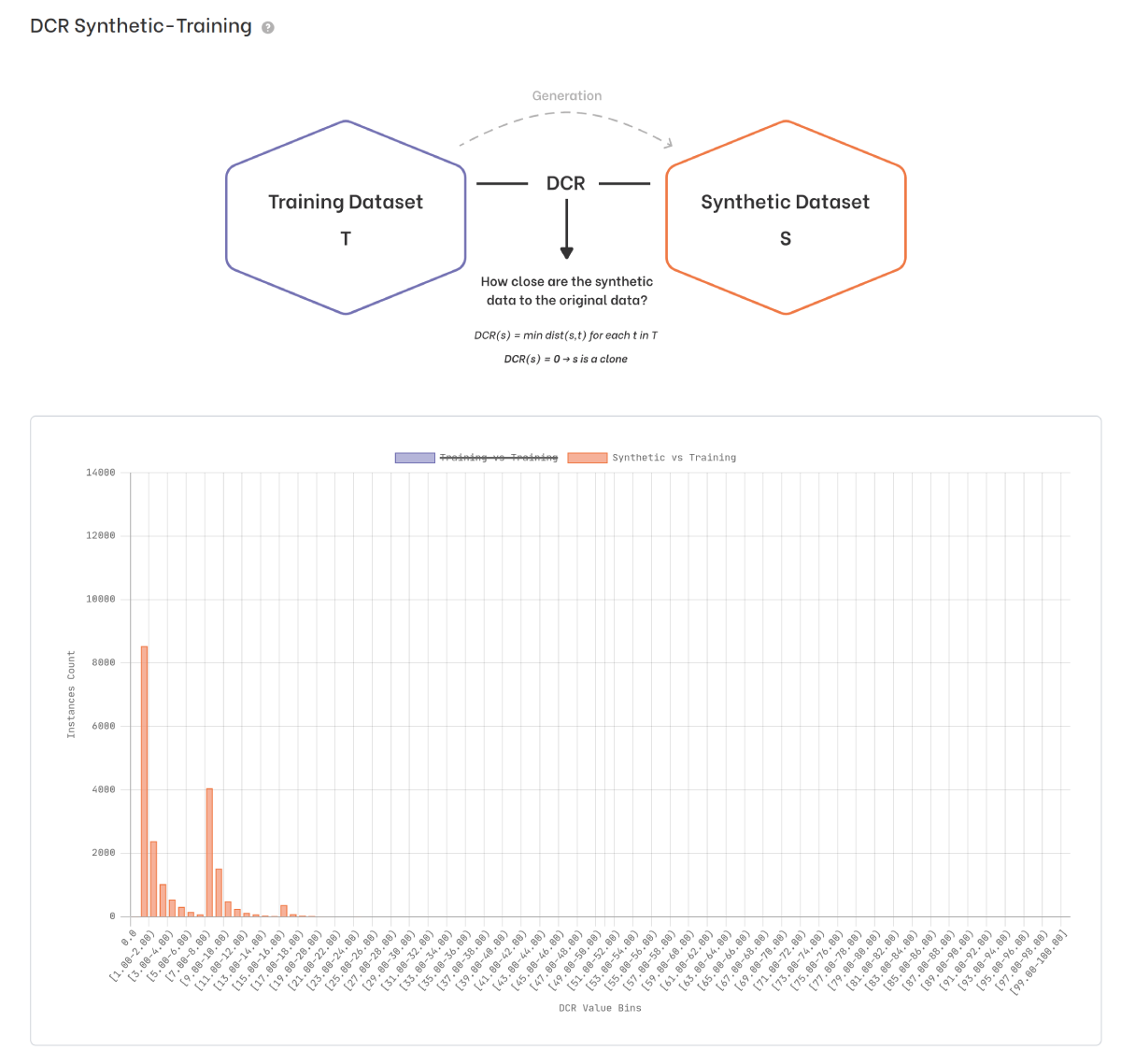 We proceed with the analysis by evaluating the DCR plot between the training dataset and the synthetic dataset: