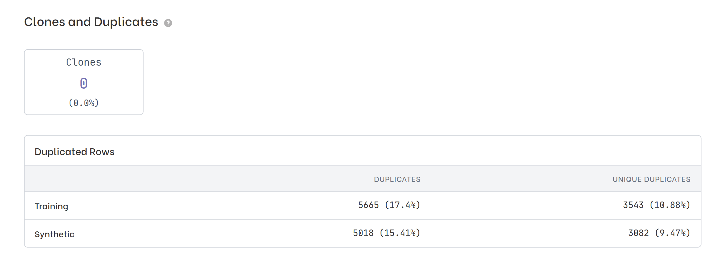 In Figure 1, we are reassured that there are no clones within the synthetic dataset. The report also gives us information (the table in Figure 1) on the number of duplicates (identical rows) within the original dataset and in the synthetic dataset . This is complementary information to the number of clones that we need it to evaluate at least two things: