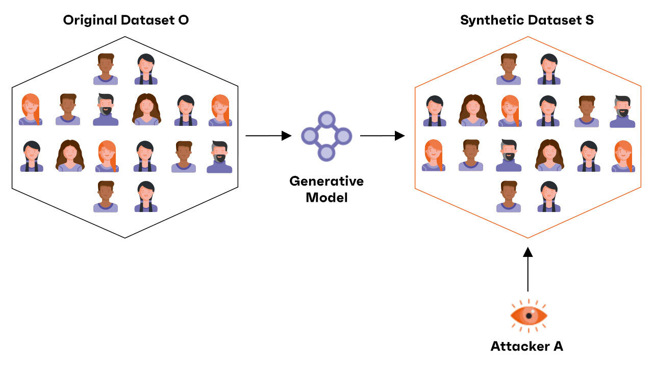 Membership Inference attacks try to infer membership of an individual in the original dataset from which the synthetic dataset was generated. For example, if the original dataset used to train the generative model consists of records of people with cancer (the cancer status is not a column of the dataset, but it’s shared as a clinical study of cancer patients), being able to infer from the synthetic data that an individual was included in the training set will reveal that that individual has cancer.
