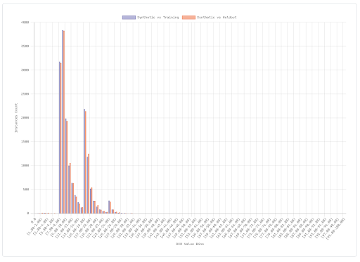 This way, in addition to calculating the DCR between the generated synthetic dataset and the training set as we did before, we can also calculate the DCR between the synthetic and the holdout dataset. Ideally we would like to check that the synthetic individuals are not systematically closer to those in the training set than those in the holdout set. We can again represent these distributions with a histogram.