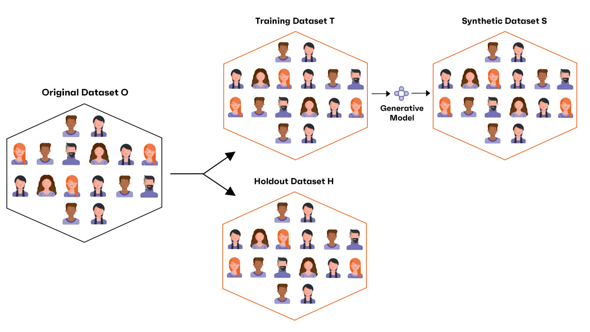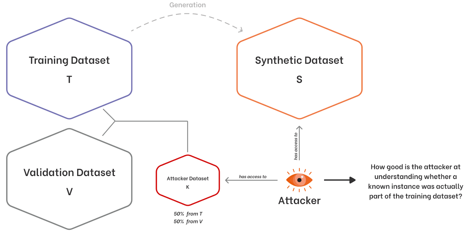 We define a Membership Inference Attack as an attempt by a hypothetical attacker A to derive the membership of a specific individual in the original dataset O from which the synthetic dataset S was generated. In this case, it is not important that the attacker is able to identify the row in S that refers to a real individual, but only that he is able to verify that a specific individual was contained in the original dataset. This is a considerable risk that should not be underestimated. Let’s assume that the original dataset contains sensitive data on the customers of a bank. For instance, all customers with a large debt to the bank. If the attacker is able to deduce that a particular individual belongs to the original dataset, he may conclude that that person is a debtor of the bank. We must try to avoid this risk as much as possible.